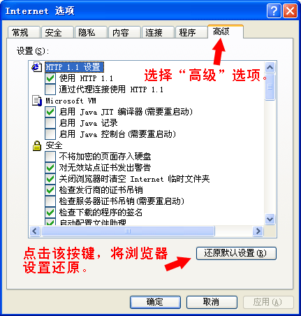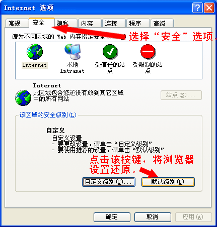 在彈出的對話框中將“安全”選項(xiàng)中設(shè)置還原為“默認(rèn)級別”